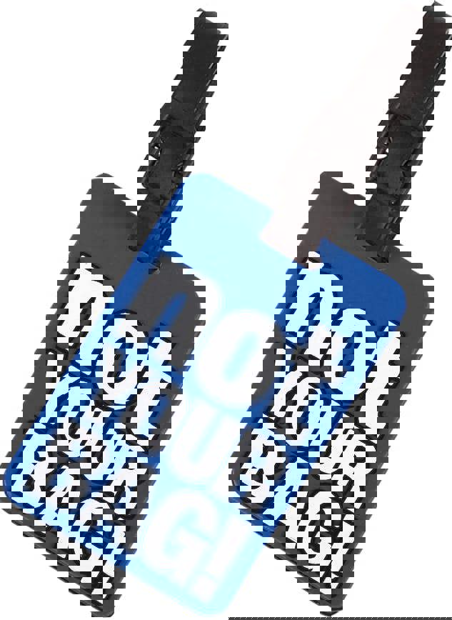 A pair of fun, novelty luggage tags to make your bags and cases stand out! Made with a durable PVC casing to prevent damage during transit, includes a clear window and card insert for you to rrd and view your details. Blue in colour with a cheeky not your BAG! slogan in raised white lettering and a black plastic strap with faux stitching effect.