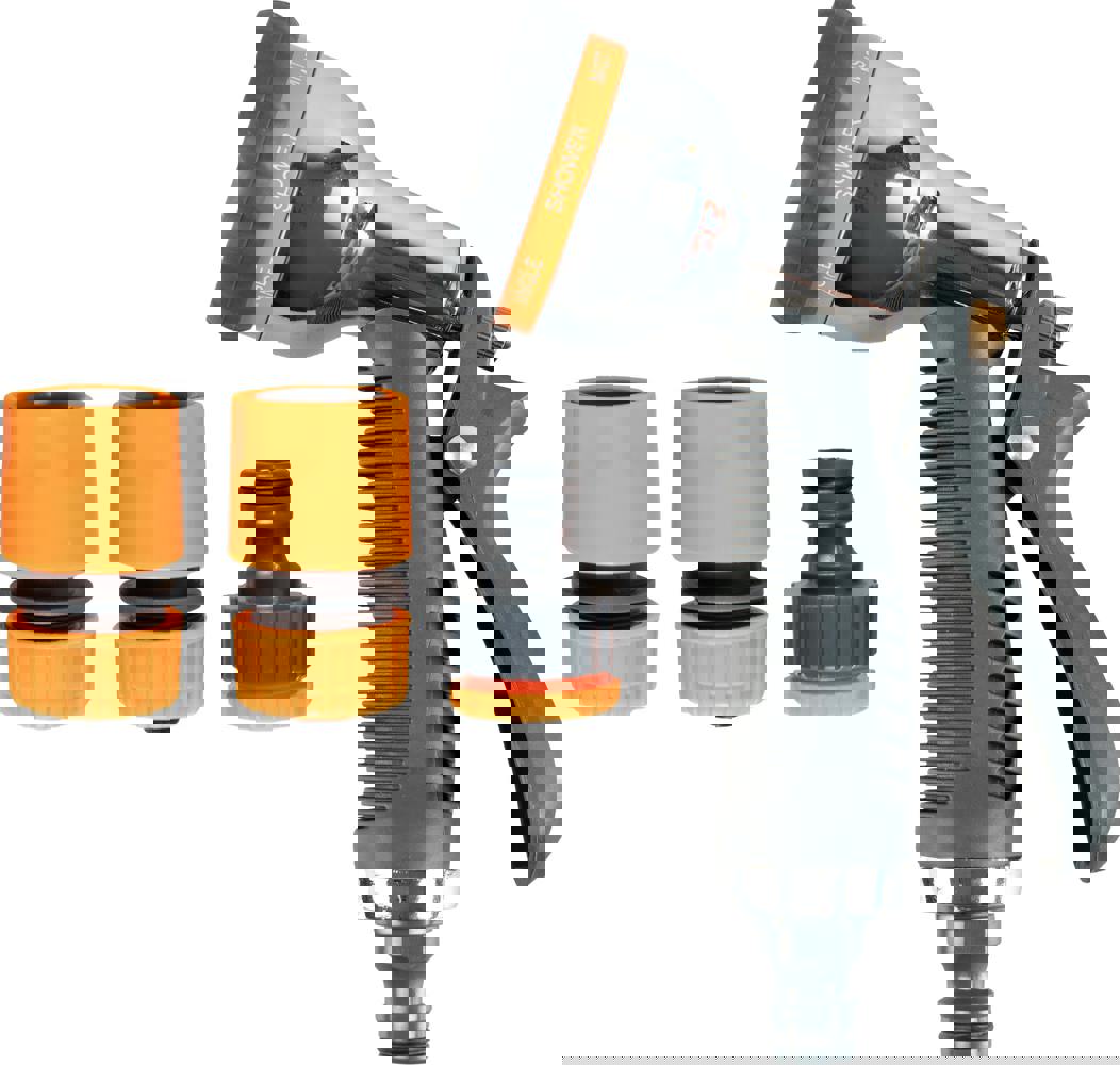 Garden Hose Spray Gun Head with Fixing Kit. Consists of a spray gun head with 8 spray settings, Mist, Centre, Flat, Cone, Soaker, Full, Angle and Shower. A hose connector, a water stop connector and a threaded tap connector.