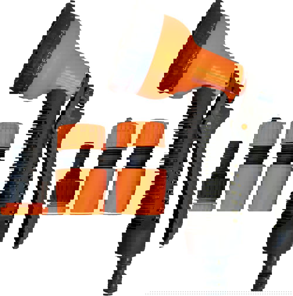 Garden Hose Spray Gun Head with Fixing Kit. Consists of a spray gun head with 8 spray settings, Mist, Centre, Flat, Cone, Soaker, Full, Angle and Shower. A hose connector, a water stop connector and a threaded tap connector.