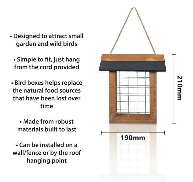 The St Helens Home and Garden wood suet cake bird feeder is a beautiful and practical way to attract wild and garden birds to your backyard or garden. This feeder is made from high-quality wood with a slate roof that is both sturdy and attractive, providing a natural and rustic look that will complement any outdoor setting. The feeder is designed to hold suet cakes, a popular bird food that is high in fat and protein, making it an ideal source of energy for birds, especially during colder months. The suet cake is held securely in place by a metal cage, which also allows birds to feed from all sides of the cake. The feeder comes with a hanging cord, making it easy to hang from a tree branch or hook, and allowing you to place it in a location that is visible to birds and convenient for you to refill. The cord is adjustable, so you can hang the feeder at your preferred height, and the wood construction ensures it is durable and long-lasting. Overall, the St Helens Home and Garden wood suet cake bird feeder is a charming addition to any garden or backyard, offering an excellent way to enjoy the beauty of wild birds while helping to support their nutritional needs.