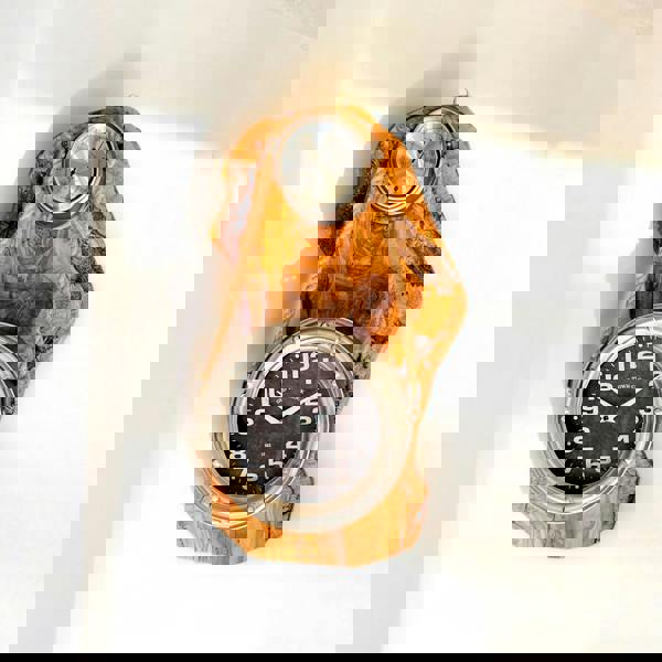 A beautifully crafted rope clock finished in stainless steel and paired with a solid olive wood base, designed to add warmth and character to your space. Each piece is made using carefully selected olive wood, shaped by skilled hands to highlight the natural grain and organic form of the timber. No two bases are ever the same, making every clock completely unique.