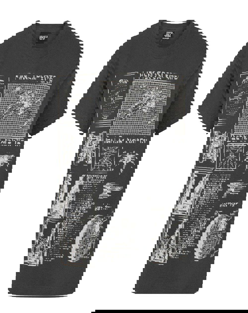 The design across the front of the t-shirt showcases detailed attack plans for taking down the iconic Death Star ruled by villain Darth Vader; the very same attack plans that Luke Skywalker implements in the Death Star Attack film