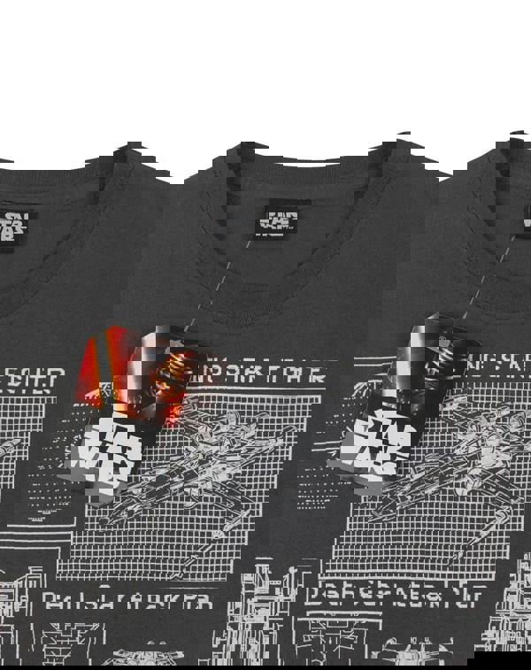 Featuring detailed blueprint styled illustrations and diagrams of the iconic X-Wing and the Death Star in crisp white, contrasting against the charcoal grey t-shirt