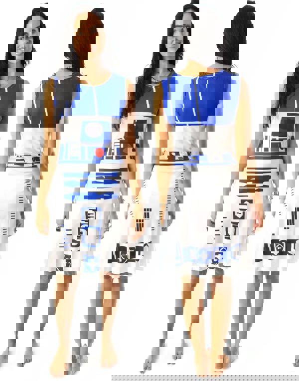 A sci-fi Star Wars gift idea for fans of the Star Wars episodes, comics, toys, or the classic George Lucas books; this Star Wars adults dress features the robot character R2-D2 as seen in the Star Wars episodes, perfect for stepping into the role of the fan favourite character!