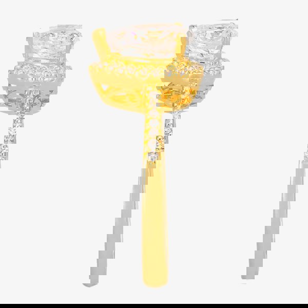 A pear-cut cubic zirconia stone is framed with delicate pavé to add a touch of shimmer to your wardrobe as the focus of this handcrafted gold-plated ring. The built-up pavé shoulders meet the cut-out raised mount just below the halo to ensure this ring sits high on the finger.