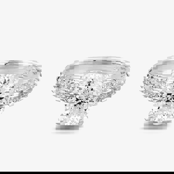 A beautifully faceted brilliant-cut cubic zirconia stone is securely held in a traditional four-claw setting, perfect for ensuring the maximum amount of light can enter the stone to ensure radiance and shimmer. Twin rows of pavé cascade down each built-up shoulder, along the knife-edge profile of the band.