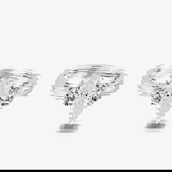 Said to represent the past, present and future, trilogy rings are a beautiful and interesting alternative to single stone settings. In this handcrafted piece, a central pear-cut stone is flanked by smaller round cubic zirconia, all held aloft on a cathedral setting with symmetric open arches.