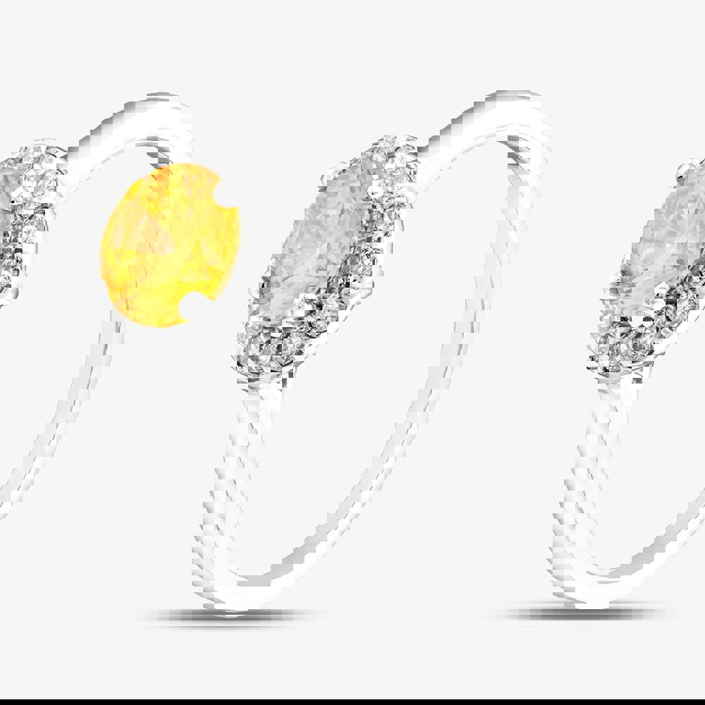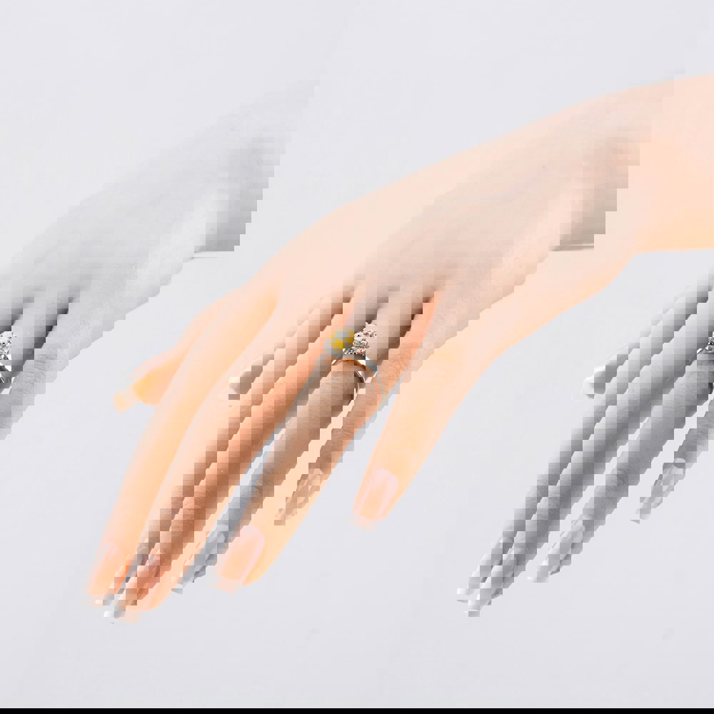 Make a bold statement with this Sterling Silver Yellow Brilliant Cut Cubic Zirconia Halo Cluster Ring. Featuring a dazzling yellow brilliant-cut cubic zirconia at its centre, surrounded by a sparkling halo of clear stones, this ring exudes elegance and sophistication. Set in polished sterling silver, it’s a stunning piece that adds a vibrant pop of colour and timeless charm to any look.