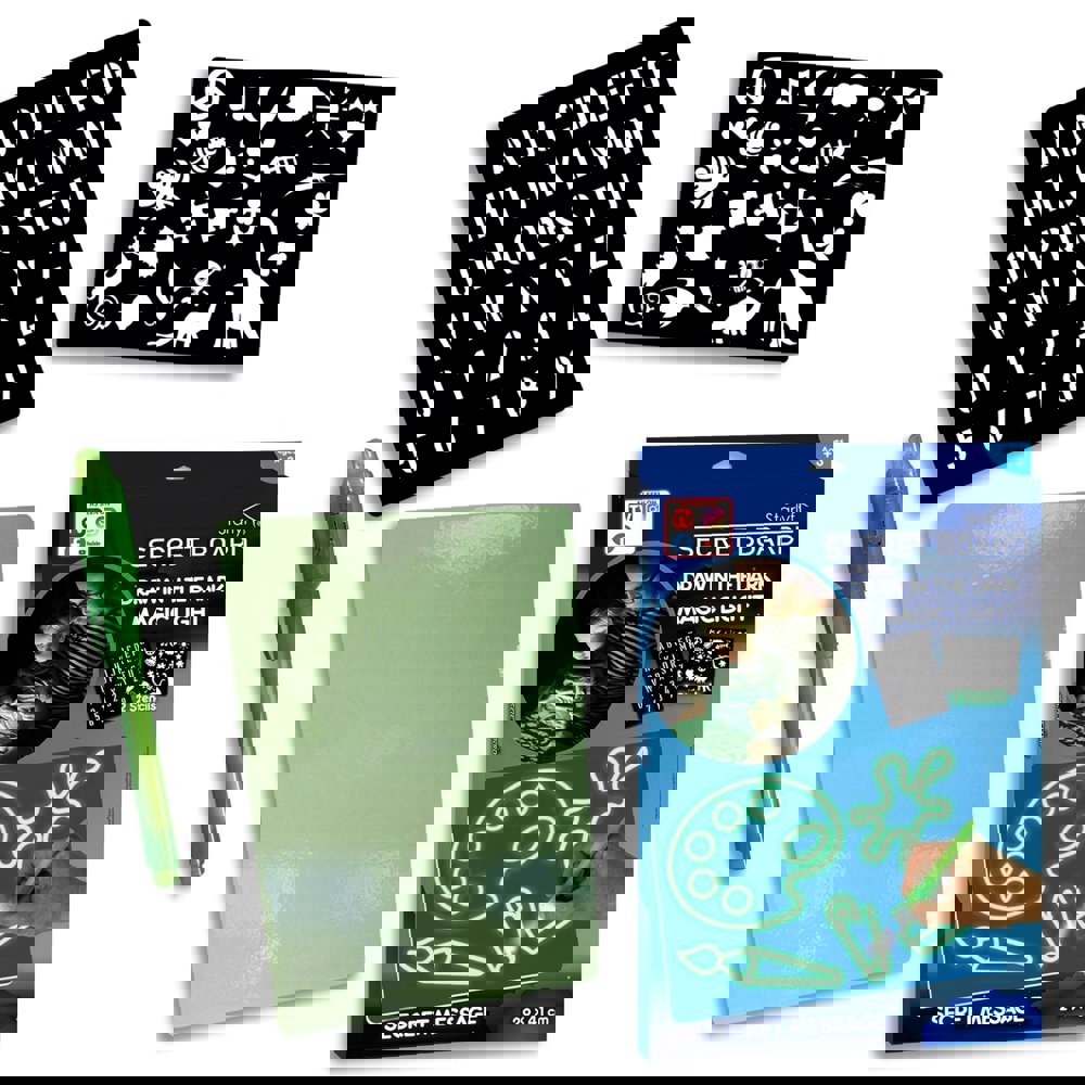 The Large Secret Board is safe and clean, it measures 29 x 41 x 1 cm and it is a large magic light drawing board where drawings will glow in the dark, thanks to its photoluminescent surface that absorbs light and then glows in the dark