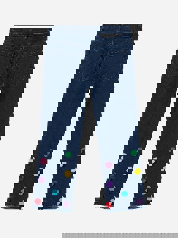 Stella McCartney Kids girls pom pom jeans in blue. Pom pom details add a distinctive finish.
