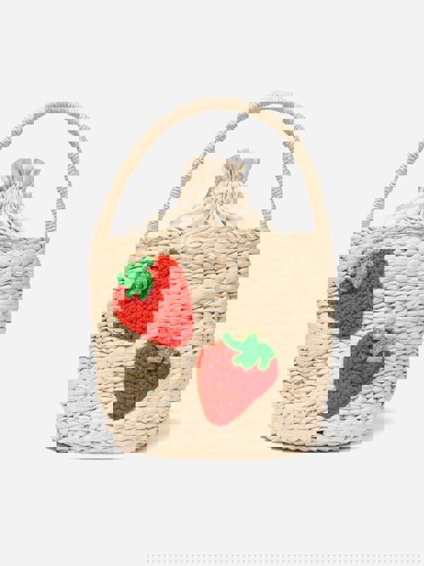 Stella McCartney Kids Strawberry bucket bag in beige, sized at 19cm. A compact accessory with a strawberry accent and bucket bag shape, created for the SS2025 collection.