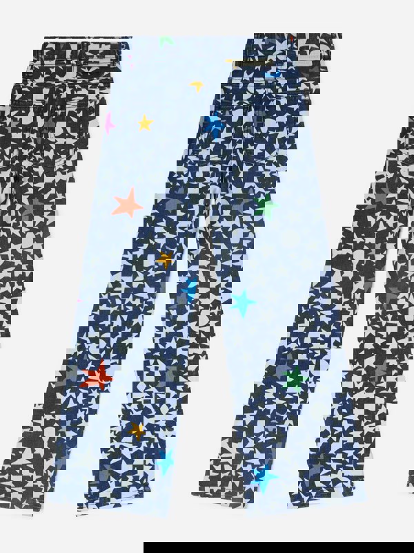 Stella McCartney Kids wide leg jeans in blue with a bold star pattern. Part of the AW2025 collection, this pair brings a playful graphic look to a classic denim style, with a wide leg cut for a modern silhouette.