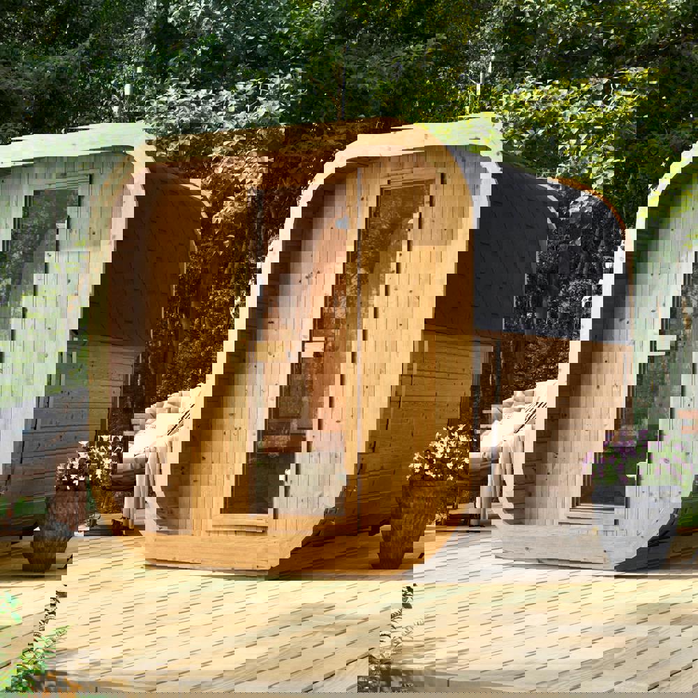 A full glass door adds a clean, architectural finish while allowing light into the interior. Thermowood walls and thermo pine benches complete the design, and a choice of shingles is included to tailor the look. The layout is designed to provide extra space behind the back for a more comfortable experience compared to traditional barrel saunas.