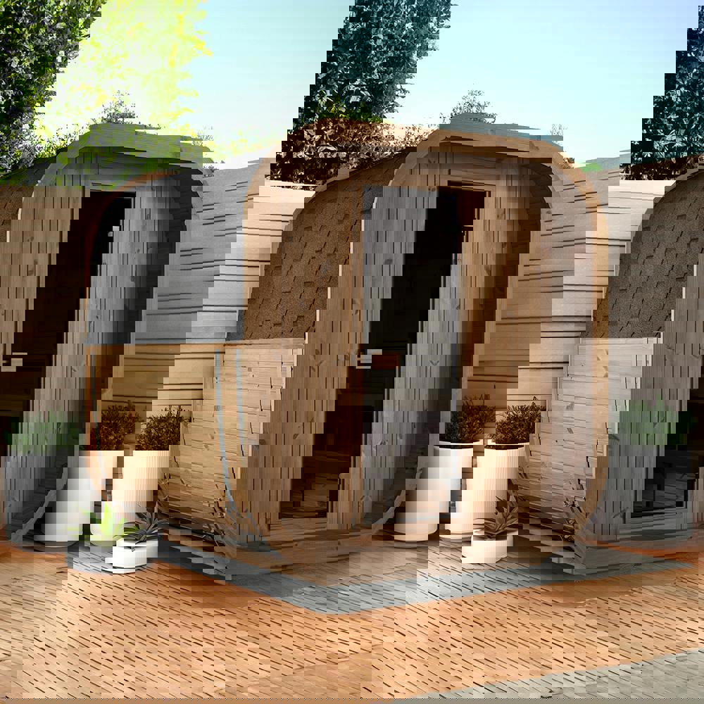 Inside, thermo pine benches create a comfortable layout, complete with included backrests for more relaxed seating. A full glass door brings a clean, contemporary finish and allows light into the sauna space. To tailor the exterior to your setting, a choice of shingles is included, letting you refine the final look to suit your garden or outdoor area.