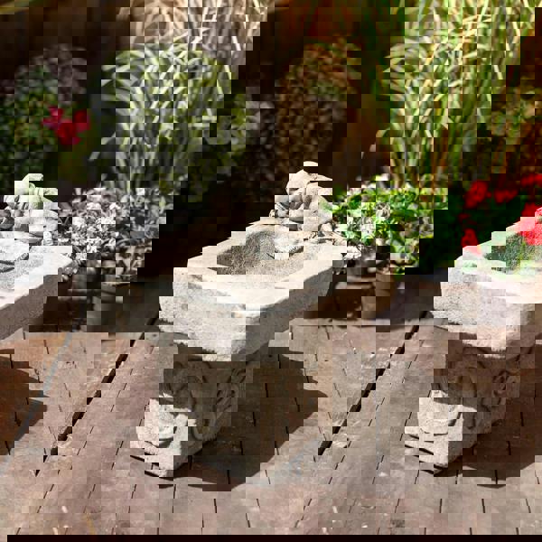 A beautiful square shaped bowl upon an ornate bottom with Oriental signs! This Birdbath would be perfect for an oriental style Garden, or any Garden looking to add a bit of Zen Energy to it. Enjoy watching the Birds use this Solid Stone Cast birdbath for many years!