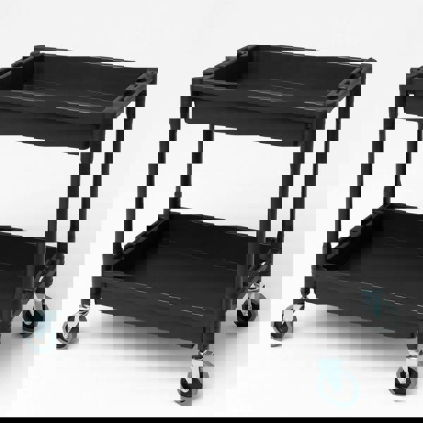 This trolley is manufactured from strong plastic and features two spacious shelves with raised edges to prevent spills and keep items secure during transport. Reinforced support legs deliver excellent load stability, while swivel caster wheels ensure smooth manoeuvrability. Two of the wheels include brakes for added safety across different floor surfaces, and the compact frame makes the trolley ideal for navigating tight spaces.