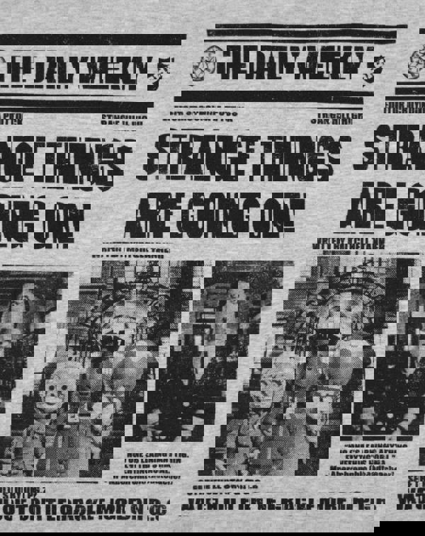 The large design showcases a fun print inspired by an old school newspaper feature reading, "Strange Things Are Going On," with two photographic images of the main characters from the extraordinary school
