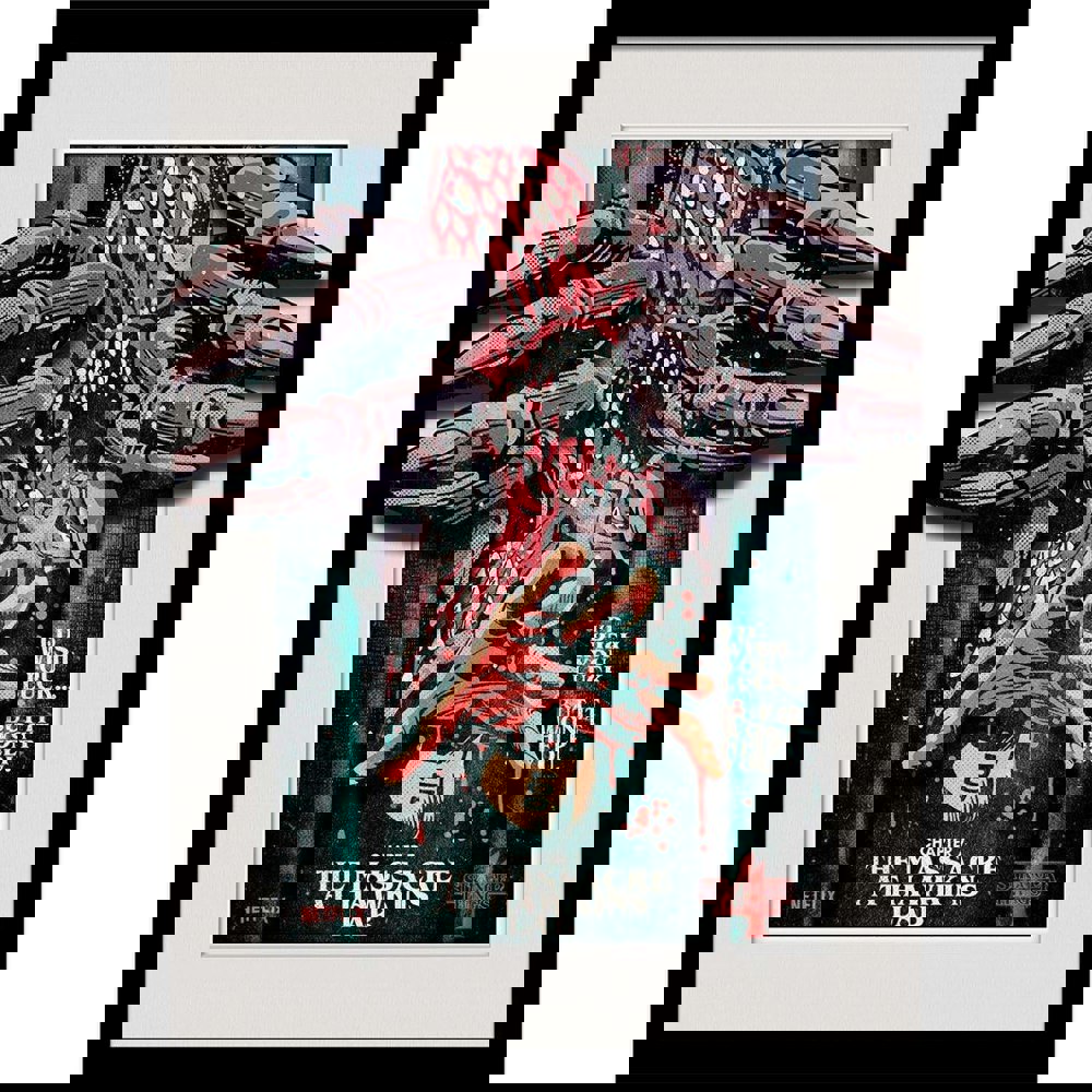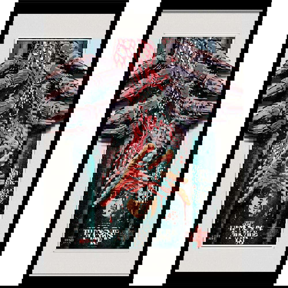 This framed poster features the Demogorgon and a multicoloured printed design with logo and text details. The plexiglass material helps present the artwork clearly, while the framed finish makes it simple to display as part of a gallery wall or as a standalone piece.