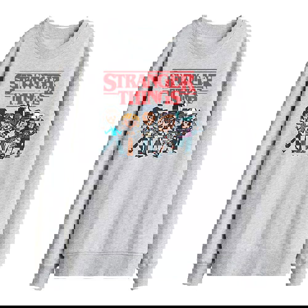 This kids’ Stranger Things sweatshirt comes in Athletic Heather with a printed cartoon group design. Made from a 50% cotton and 50% polyester blend, it uses a midweight fabric with breathable technology. The crew neck and pull over fastening keep the finish simple and easy to wear.