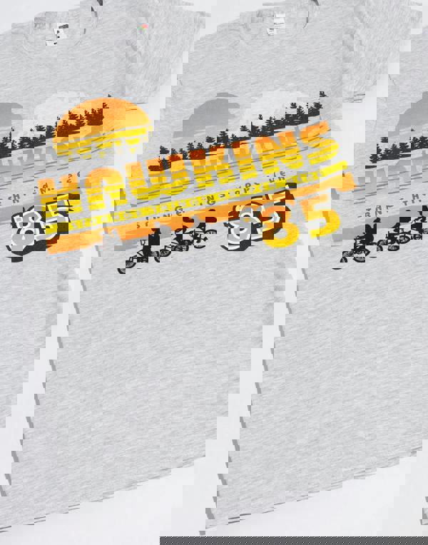 The clothing comes in grey featuring a silhouette of Mike, Dustin, Lucas and Eleven riding in Hawkins town