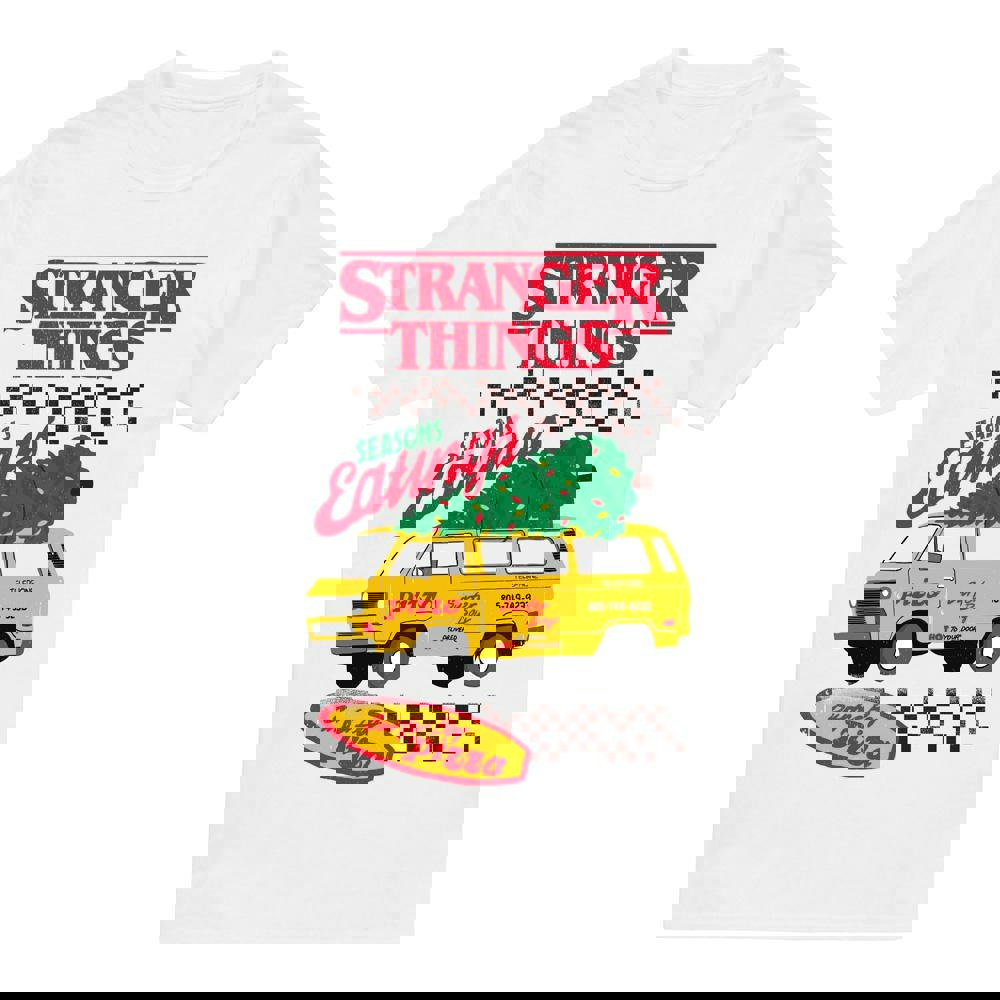 Bring a playful touch to your everyday wardrobe with the Stranger Things Mens Seasons Eatings Pizza Van T-Shirt in white. Designed for casual wear, this short-sleeved style is easy to pair with your favourite jeans, shorts or layered looks, making it a simple choice for relaxed days.