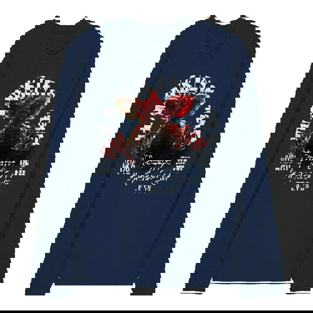 Bring a distinctive Stranger Things look to your everyday wardrobe with the Unisex Adult Hawkins 85 Demogorgon Long-Sleeved T-Shirt in navy. Featuring a printed Demogorgon character design, it’s an easy choice for casual wear and relaxed layering.