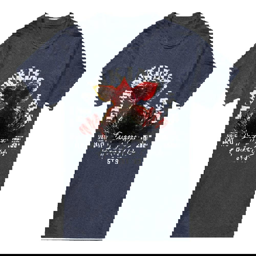 Bring a touch of Stranger Things to your everyday wardrobe with the Unisex Adult Hawkins 85 Demogorgon T-Shirt in navy. Officially licensed, it features a printed Demogorgon character design that adds a distinctive finish to a casual look.