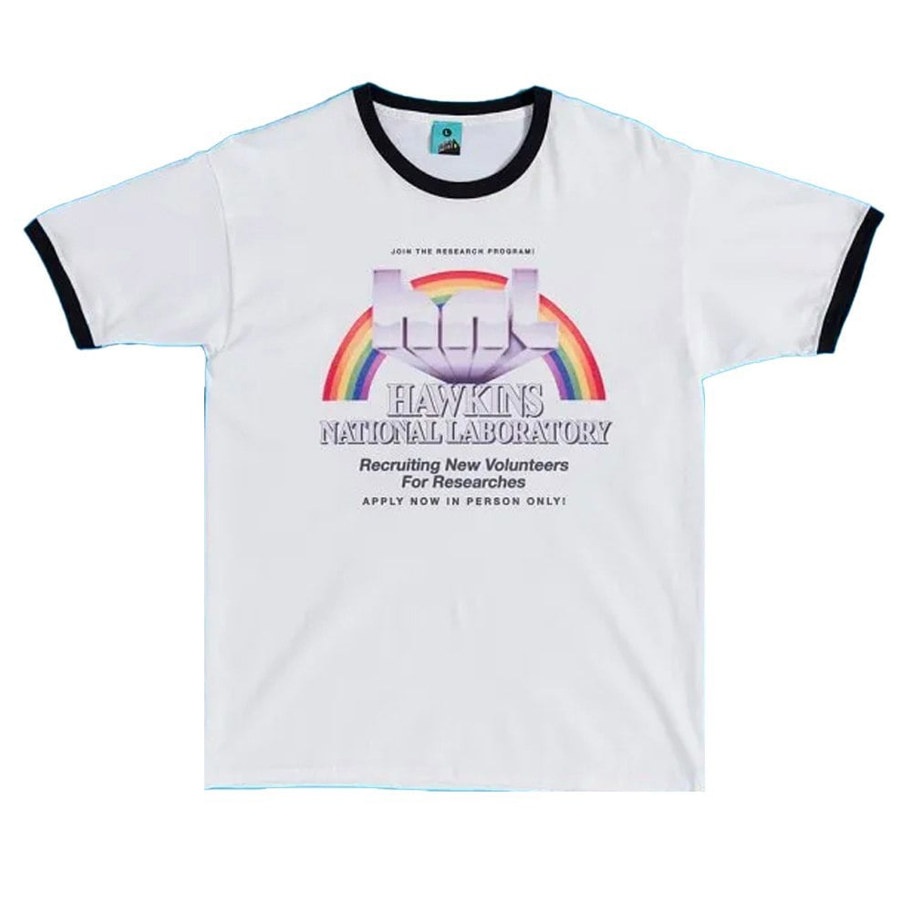 The Stranger Things Unisex Adult Hawkins National Laboratory T-Shirt is a short-sleeved style designed for everyday wear. Finished in white, it features a printed, distressed design that brings a distinctive look to casual outfits.