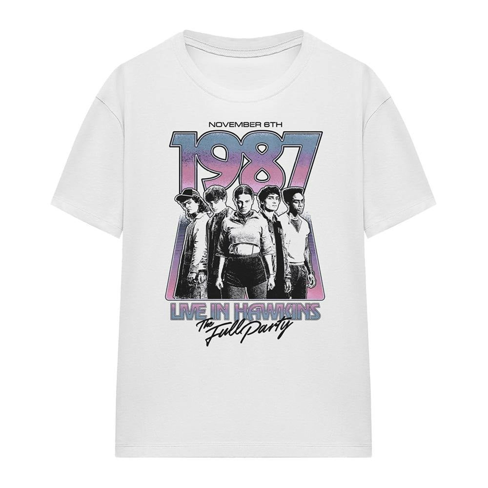 The Stranger Things Womens Hawkins 1987 Group Tour Poster T-Shirt is a printed, officially licensed design made for everyday wear. Finished in white, it offers an easy option for casual styling, whether you are dressing for relaxed weekends or adding a graphic touch to your usual wardrobe.