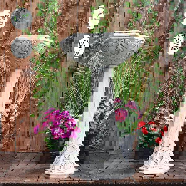 Coming in a rustic vintage finish, this outdoor birdbath features a simple support rod that is decked out in eye-catching art deco simple and neat elements. The pedestal base leads to a bowl that continues smooth pattern across the bottom, holding water in a simple yet exquisite design. This robustly made concrete birdbath will attract a bit more wildlife and bring an admirable water feature to your garden space.