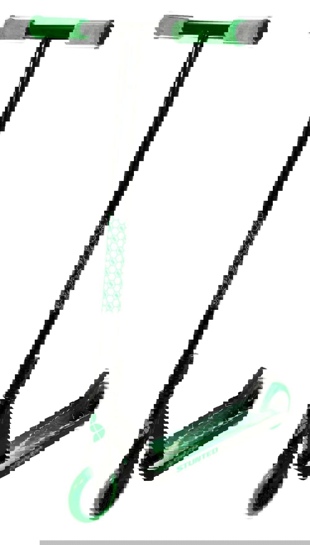 Enter the world of stunt scootering with the Stunted Glowstorm Pro - glow in the dark stunt scooter! Featuring black matte finish and contrasting glow in the dark elements, this scooter is sure to stand out! This scooter is ideal for beginner riders and up and is flush with features to ensure the best ride with the highest quality! The single piece design of the handlebar and stem along with the pro-grade triple clamp ensures a solid steering base with moulded, glow in the dark grips for comfort. The aluminium box deck offers superb stability at a light weight and therefore great for perfecting tricks like whips. To keep 360° tricks, steering and riding smooth (as well as fast), the scooter features a threaded headset and ABEC 7 wheel bearings. The tyres are constructed from a solid, puncture proof PU cast with PP spoked cores to ensure excellent stability and streamline performance. And when you need to stop, the reactive rear footbrake will 'grind' you to a halt in a smooth and controlled manner.
