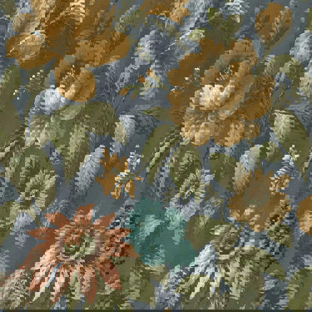 Set against the background are large, intricately painted botanical blooms. The flowers are highly detailed yet softly romantic, each bloom is surrounded by elegantly sweeping stems and luscious leaves.