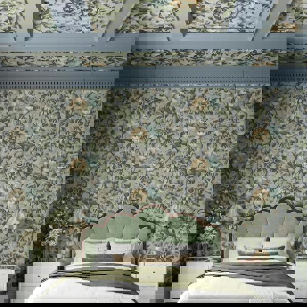 Gardenia wallpaper evokes a sense of richness, and opulence. The backdrop feels enveloping and intimate, like the fabric of a luxury curtain.