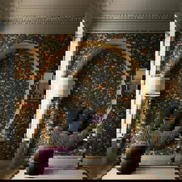 Gardenia wallpaper evokes a sense of richness, and opulence. The backdrop feels enveloping and intimate, like the fabric of a luxury curtain.