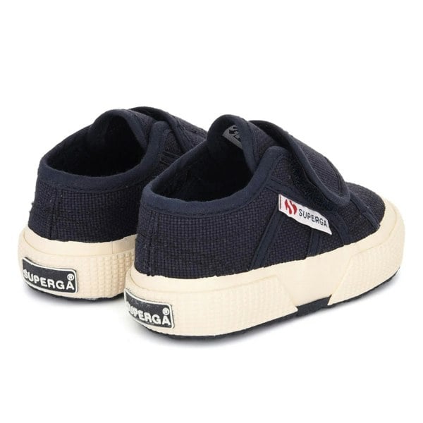 Superga Baby 2750 Bstrap trainers in navy with a low-cut profile and round toe. The upper combines canvas and cotton, with a cotton lining and a vulcanised gum sole. A hook and loop strap fastening secures the fit, while a flat heel keeps the silhouette simple and streamlined.