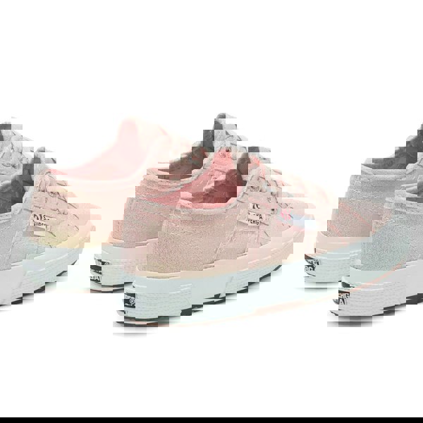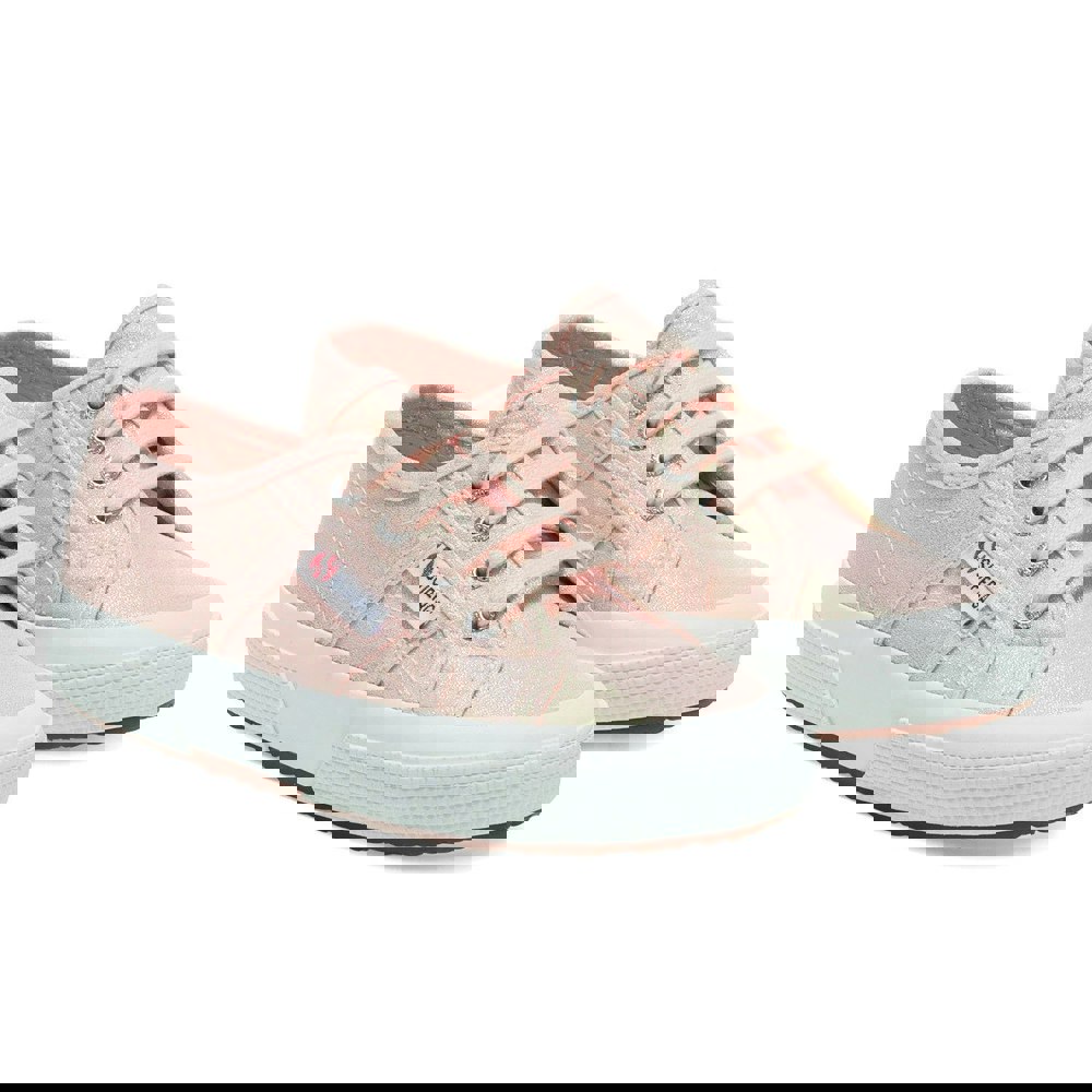 These Superga 2750 Lamew lace up trainers for children come in a pink ish iridescent finish with a low-cut profile and flat sole. The upper combines cotton canvas with metallic thread, paired with a lamé fabric for a distinctive look. A round toe keeps the shape classic, while the lace-up fastening threads through four eyelets for a secure fit.