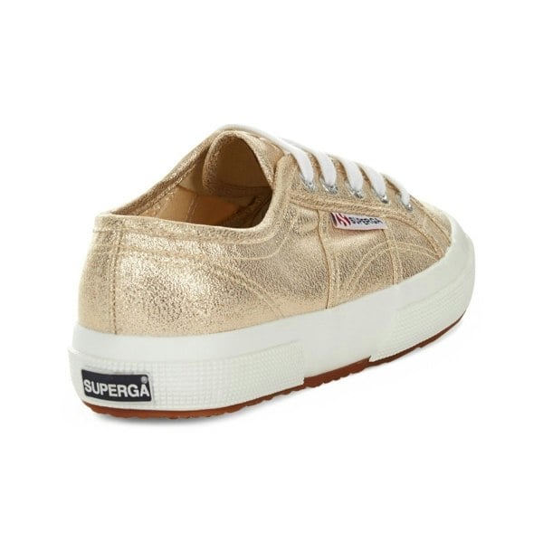 These low cut trainers combine a canvas and lamé upper with a metallic finish in yellow gold. A round toe and flat profile keep the shape classic, while the lace-up fastening secures the fit through five eyelets. The insole is branded and the lining is unlined for a clean internal finish.