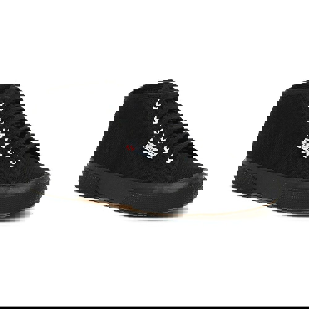 These unisex Superga 2754 Cotu trainers come in a full black finish with a mid cut profile and contrast detailing. The upper combines canvas and cotton, paired with a vulcanised gum sole for a classic trainer construction. A round toe and flat heel keep the shape clean and versatile for everyday wear.
