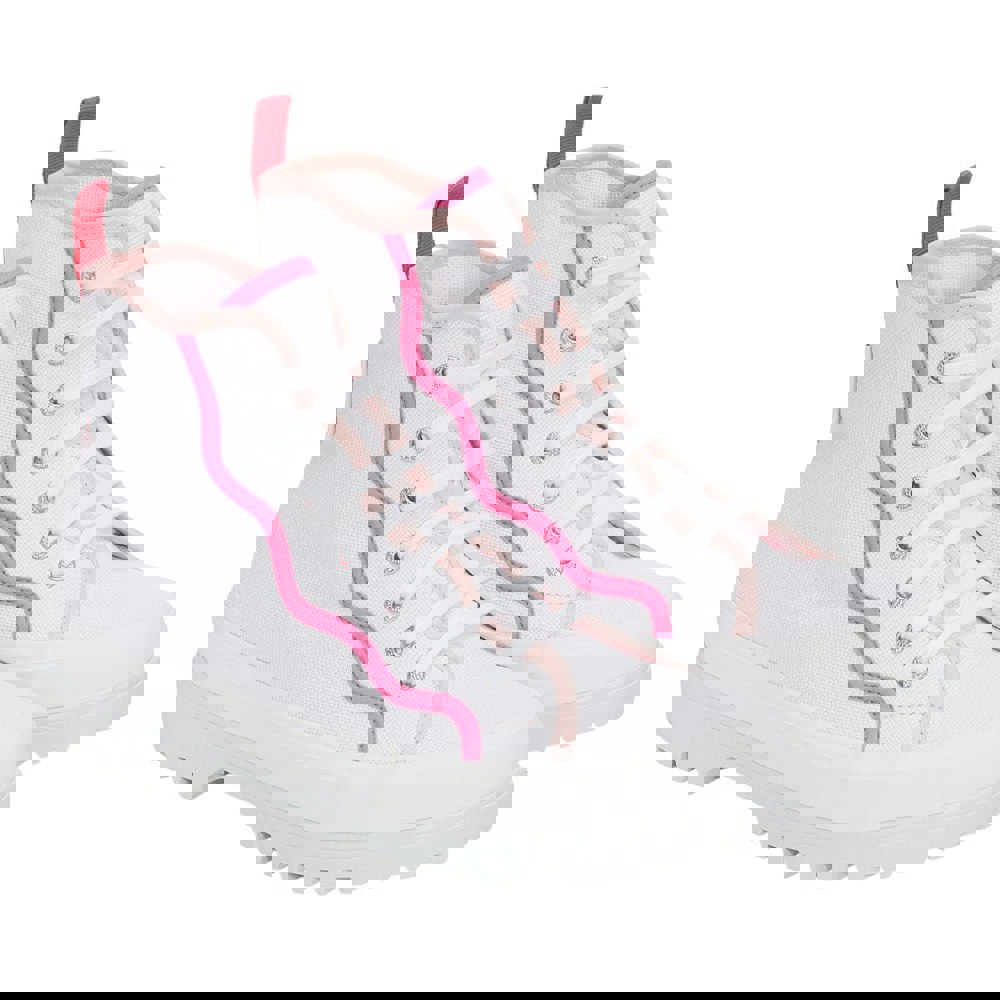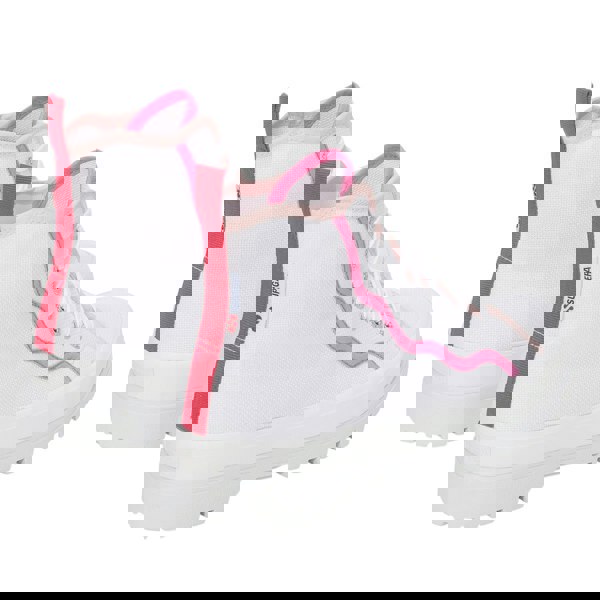 These ankle-high boots combine a cotton canvas upper with a two-tone white and pink finish. The design uses a lace-up fastening with cotton laces and seven engraved aluminium eyelets, finished with a pull tab for easy on and off. A branded insole and jacquard label add signature detailing, while the round toe and flat heel keep the silhouette clean and practical.