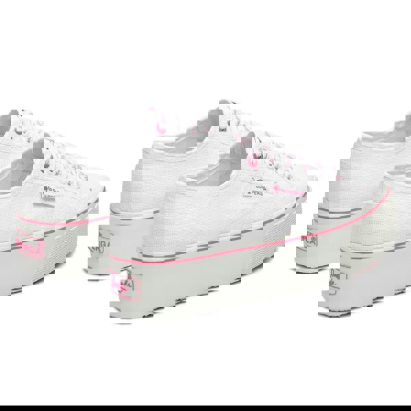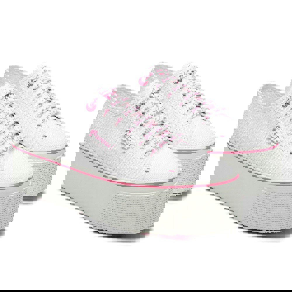 These Superga womens 2790 Classic Barbie trainers come in white and pink with a low-cut profile and a round toe. The upper is made from cotton canvas and finished with contrast detailing and a repeat logo design. A flatform, chunky vulcanised rubber outsole adds a bold base, while the lace-up fastening keeps the look classic and secure.