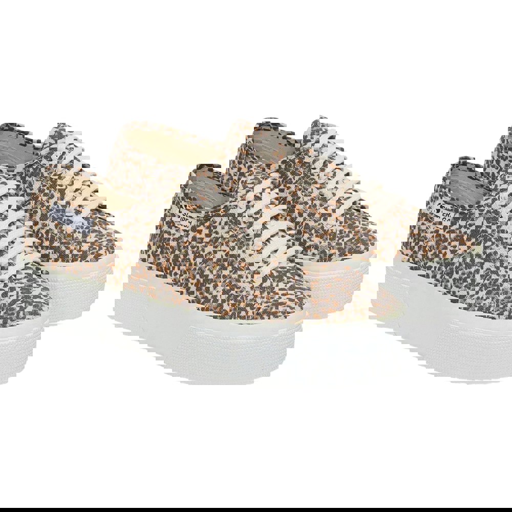 These Superga 3740 Leggera platform trainers combine a low-cut profile with a leopard print and logo design. The upper is made from cotton canvas, paired with a breathable cotton lining for a clean, classic finish. A lace-up fastening with cotton laces secures the fit, while six engraved aluminium eyelets add a distinctive detail.