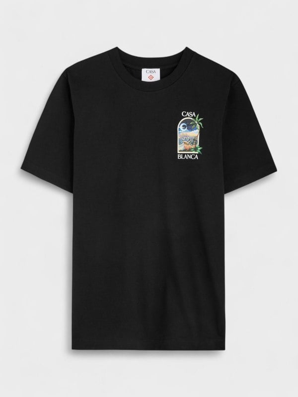 The Casablanca LA Nights T Shirt in black features a striking printed design that captures the essence of an LA nighttime landscape. Made from 100% organic cotton, this short-sleeve tee offers comfort and sustainability. Its classic crew neck and delicate machine wash care make it a versatile and easy-to-maintain wardrobe staple. Crafted in Portugal, this updated sizing ensures a perfect fit—choose your usual size for the best wear.