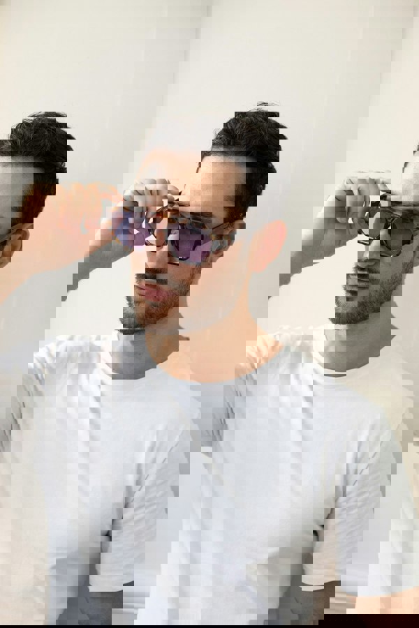 Angular Navigator Style Sunglasses in Leopard Print with Purple Lenses by SVNX. These bold sunglasses feature a striking leopard print frame with an angular navigator design, complemented by vibrant purple lenses. Perfect for making a fashion statement with a touch of wild sophistication. All our sunglasses are FDA approved.