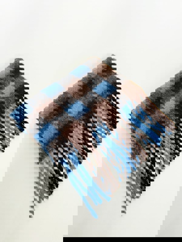 Chunky Scarf in Brown and Blue Check by SVNX. This cozy accessory features a rich brown and blue check pattern, crafted in a chunky knit for extra warmth and style. Perfect for adding a touch of sophistication and comfort to your cold-weather outfits.