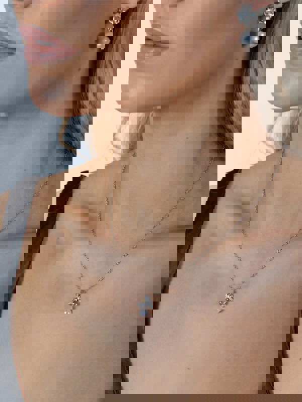 Diamante Bow Pearl Necklace. A delicate and feminine necklace featuring a sparkling diamante bow paired with a lustrous pearl. This elegant design is the perfect blend of charm and sophistication, ideal for special occasions or adding a touch of glamour to your everyday style.