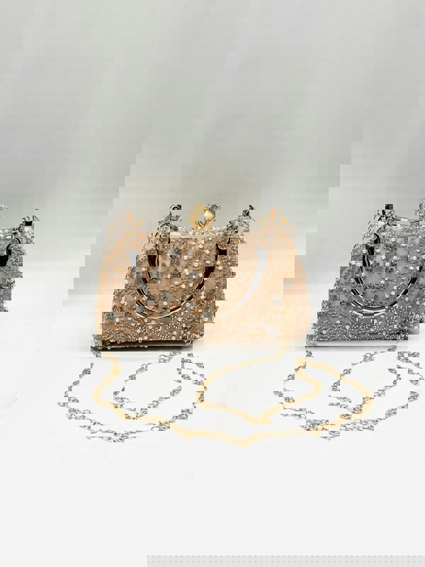 Elevate every look with our timeless clutch bags—crafted for elegance, designed to impress. Featuring refined finishes and a sleek chain strap, they’re the ultimate statement in luxury. L:21. 5cm W:8cm H:13. 5cm Polyester. Chain strap included. Colour: Champagne. SKU: HB361808.