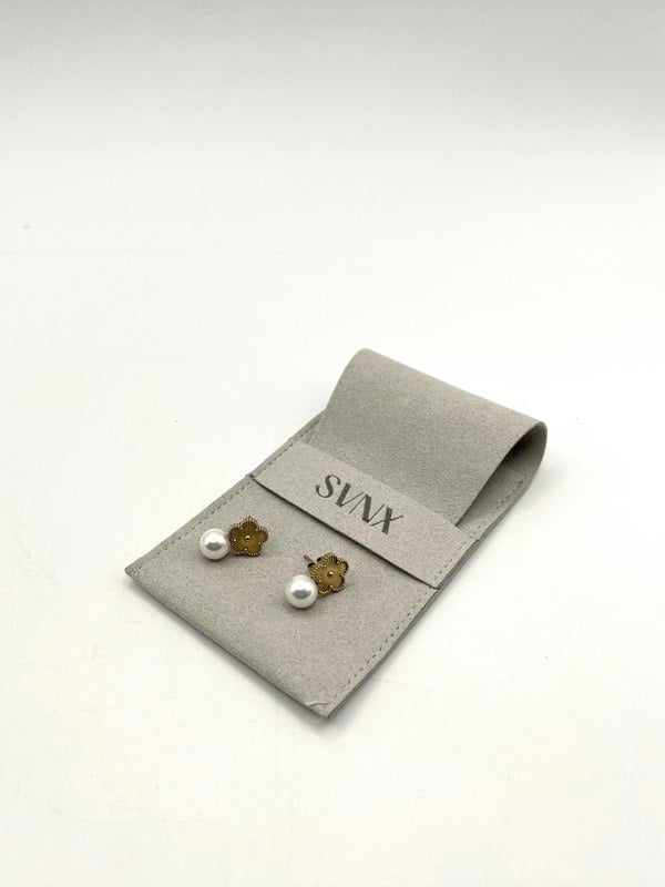 Clover Earrings with Pearl Detail in Gold. Featuring a delicate clover design adorned with a lustrous pearl, this elegant piece adds a refined touch to any outfit.