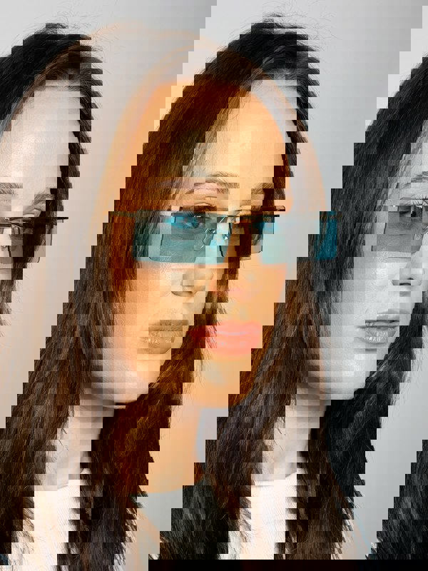 Frameless Rectangle Sunglasses in Pale Blue by SVNX. These sleek sunglasses feature a minimalist frameless design with a cool, pale blue tint, offering a contemporary and sophisticated look. Perfect for adding a touch of subtle color and modern elegance to any outfit. All our sunglasses are FDA approved.