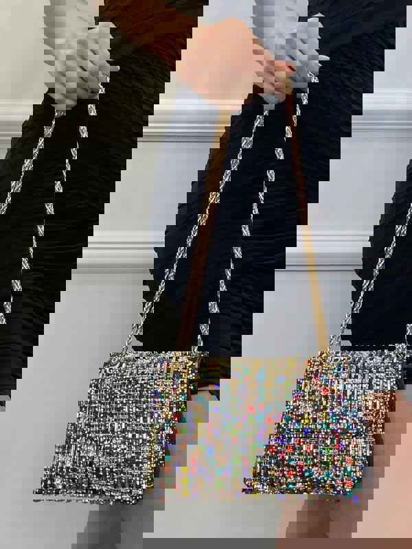 Make a bold statement with the Multi-Coloured Embellished Clutch Bag by SVNX. Bursting with vibrant colors and intricate embellishments, this eye-catching piece brings a playful yet chic touch to any outfit. Carry it as a standout double chain shoulder bag or use the chain strap for crossbody. Perfect for adding flair to your look, this bag is a celebration of style and color.