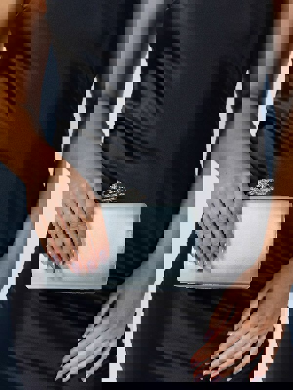 Satin Clutch Bag featuring a beautiful flower jewel top and an optional chain strap. This elegant piece adds a touch of glamour to any outfit, perfect for special occasions or evening events. H:9cm W:17cm L:4cm SKU:HB342707